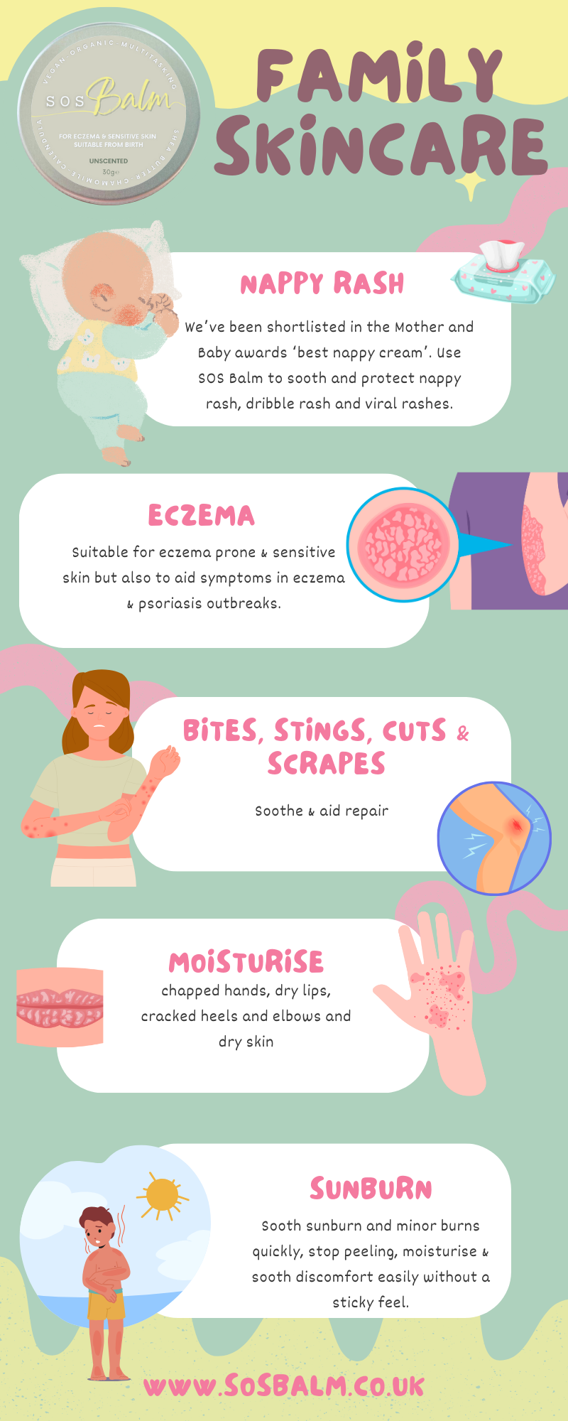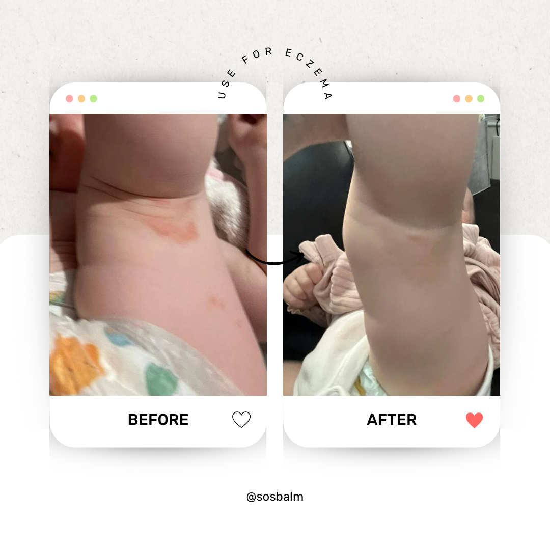 SOS Balm® was designed by a mum for her baby's eczema prone skin to replace nappy rash cream, moisturiser and baby oil. All of her favourite products were full of irritating ingredients for her baby's sensitive skin.